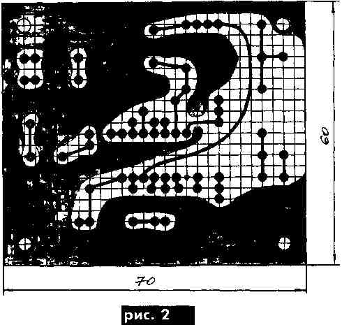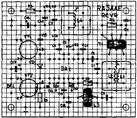Если детали исправны и сборка приемника проведена аккуратно и без ошибок, налаживание сводится к уточнению границ диапазона с помощью подстроечника L4 и настройке на максимальную громкость входной катушкой L2. Резисторы R4 и R7 конструктивно размещены на выводах переменных резисторов R3 и R6, а конденсатор С8 - на выводе КПЕ С9. Рисунок печатной платы и расположение элементов приемника показаны на рис.2.