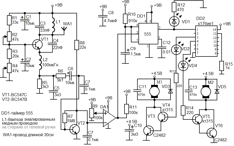 Для радиоуправления нужны приёмник и передатчик. Приёмник более сложен в изготовлении чем передатчик. Сверхрегенеративный приёмник более прост в изготовлении чем другие (т.к. содержит меньше деталей) поэтому для простых радиоуправляемых игрушек, моделей и др. устройств лучше использовать его. Схема приёмника: