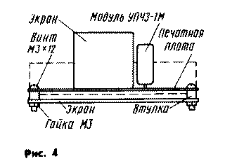 По размерам платы из дюралюминиевого сплава делаются основание, прикрепляемое к ней снизу посредством винтов МЗ и металлических втулок длиной 5 мм, которое играет роль экрана (рис. 4). В плате и основании следует просверлить отверстия для доступа к подстроечным элементам (С12, L4) и под крепежные детали.