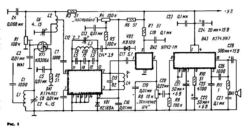 С части витков катушки L2 сигнал РЧ поступает на смеситель, выполненный на микросхеме DA1. На ней же собран генератор плавного диапазона. Его частотозадающий контур L3C12 перестраивают варикапом VD2 в пределах 139,9...139,2 МГц. Колебания промежуточной частоты 6,5 МГц выделяются на контуре L4C15. Выбранная ПЧ определяется используемым модулем УПЧЗ1М. В составе модуля имеется двухкристальный полосовой фильтр, восьмикаскадный усилительограничитель ПЧ, детектор и предварительный усилитель 34, Активная часть модуля выполнена на микросхеме К174УР4.