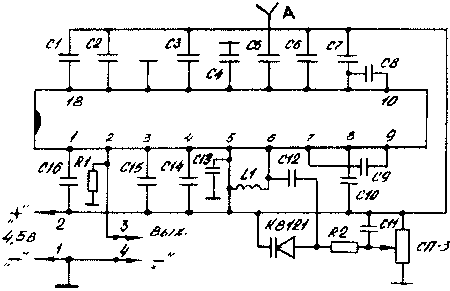 Приемники УКВ диапазона, имеющие частотную модуляцию и следовательно низкий уровень атмосферных и промышленным помех, обладают высоким качеством звучания. Набор радиодеталей позволяет собрать УКВ ЧМ приемник на базе микросхемы КС1066ХА1(аналог ТДА-7000 фирмы "Филипс"). В состав микросхемы входит регулятор бесшумной настройки ,открывающий тракт звуковых частот только при наличии сигнала принимаемой станции, Напряжение звуковой частоты на выходе приемника ~70МВ(на нагрузке 22к при напряжении 4,5 Вольт). Электронное устройство на базе варикапа KB 121 А позволяет перекрыть отечественный(65,8-73,0МГц)или зарубежный(88,О-108,0МГц)УКВ диапазоны. Выход приемника хорошо согласуется с любым усилителем низкой частоты с входным сопротивлением не менее 22К (усилители на ИМС К174УН7,К174УН14 и т.д.) Подключение УКВ приемника через головные телефоны показано на рис.1, а к усилителю на м/с К174УН14—на Рис,2.При напряжении: питания усилителя (на рис.2) выше 4,5 вольт, питание на УКВ приемник 4,5 вольт подавать через параметрический стабилизатор. К выходу радиоприемника можно подключить стереодекодер и таким образом получить возможность принимать стереопередачи,