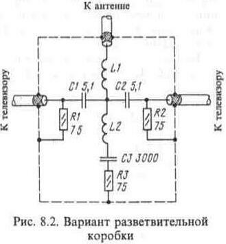 На рис. 8. 1, а приведена принципиальная схема разветвительной коробки на два отвода от абонентского кабеля коллективной антенны, а на рис. 8. 1, 6 - на три отвода. Коробка устанавливается в удобном месте квартиры, ее вход подключается к уже имеющемуся кабелю от разветвительной коробки коллективной антенны, а выходы соединяются телевизионными кабелями с телевизорами. К каждому выходу подключается один телевизор. Если по каким-то причинам к одному из выходов телевизор не будет подключен (например, его увезли на дачу или отправили в ремонт), к штекеру, предназначенному для подключения к антенному гнезду телевизора, нужно подключить резистор сопротивлением 75 Ом. В противном случае произойдет рассогласование, и изображения на экранах других телевизоров начнут двоиться. По этой же причине не следует делать в коробке лишние отводы, а если они имеются, к каждому из них нужно подключить резистор на 75 Ом.