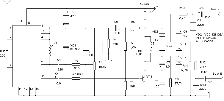 Налаживание тюнера заключается в настройке катушки L1 на верхнюю границу диапозона (108 МГц). Резистором R1 регулируют необходимую чувствительность. Резистором R3 добиваются того, чтобы не было перегрузки стереодекодера. Резистором R5 регулируют переходное затухание между каналами.