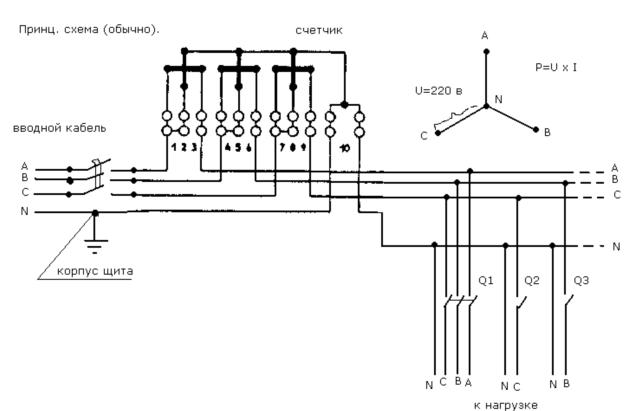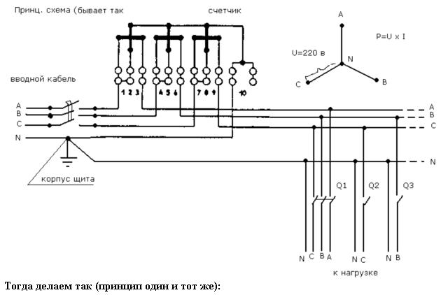 Теперь если автомат Q выключен или включен, но в розетку не чего не включено, счетчик будет работать как раньше, (нормально). Если же включить автомат Q, а потом включить в ту розетку, какой ни будь электроприбор, к примеру, приемник, лампу накаливания или просто перемычку (далее прибор) (прибор работать не будут) счетчик перестанет учитывать любую нагрузку в фазе, к которой подключена эта розетка в нашем случае фаза С- Теперь вы можете на эту фазу (у нас автомат Q2) навесить всю однофазную нагрузку дома базы ... Трехфазная нагрузка же будет учитываться счетчиком, как и раньше, полностью т.к. напряжение на других лучах звезды (не в сети) повысится на корень из трех. В случае проверки даже если вы не выключите автомат Q или прибор из розетки работник Энергсбыта перед проверкой выключит автомат Q .Так как этот способ практически не кому не известен даже в Энергосбыте,в случае появления аномалий ни кто не чего не поймет .Ну а если прибор выключен то и придраться к схеме не возможно .