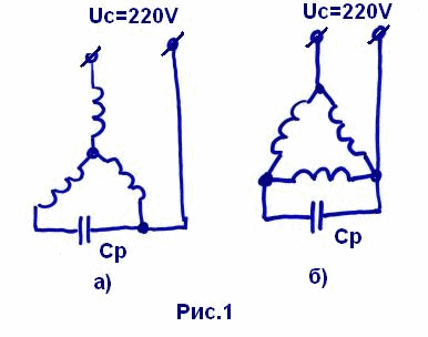 Подключить трёхфазный электродвигатель на 380В к однофазной сети 220В очень просто. Достаточно подключить фазосдвигающий конденсатор, ёмкость которого выбирается из расчета примерно 7мкФ на 100Вт мощности эл.двигателя. Рис.1 и 2. Пусть не смущает разница в напряжении. Просто теряется мощность эл.двигателя. В зависимости от типа двигателя и схемы подключения мощность двигателя может уменьшится на 20-60%. Почти все электродвигатели гарантированно запускаются и нормально работают. Трудности с запуском как правило возникают с эл.двигателями на 3000 об/мин, например отечественной серии 4А или если предполагается использовать двигатель с тяжелым пуском (к примеру с приводом на клиноременную передачу), в этом случае эксперементально подбирается ёмкость в сторону увеличения. Но сильно увлекаться этим не стоит, как правило увеличивают не более чем в два раза. При боль