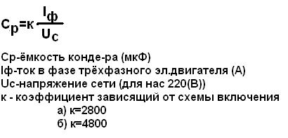 сли на двигателе есть бирка с его данными, то подключаемую ёмкость можно подсчитать по формуле: