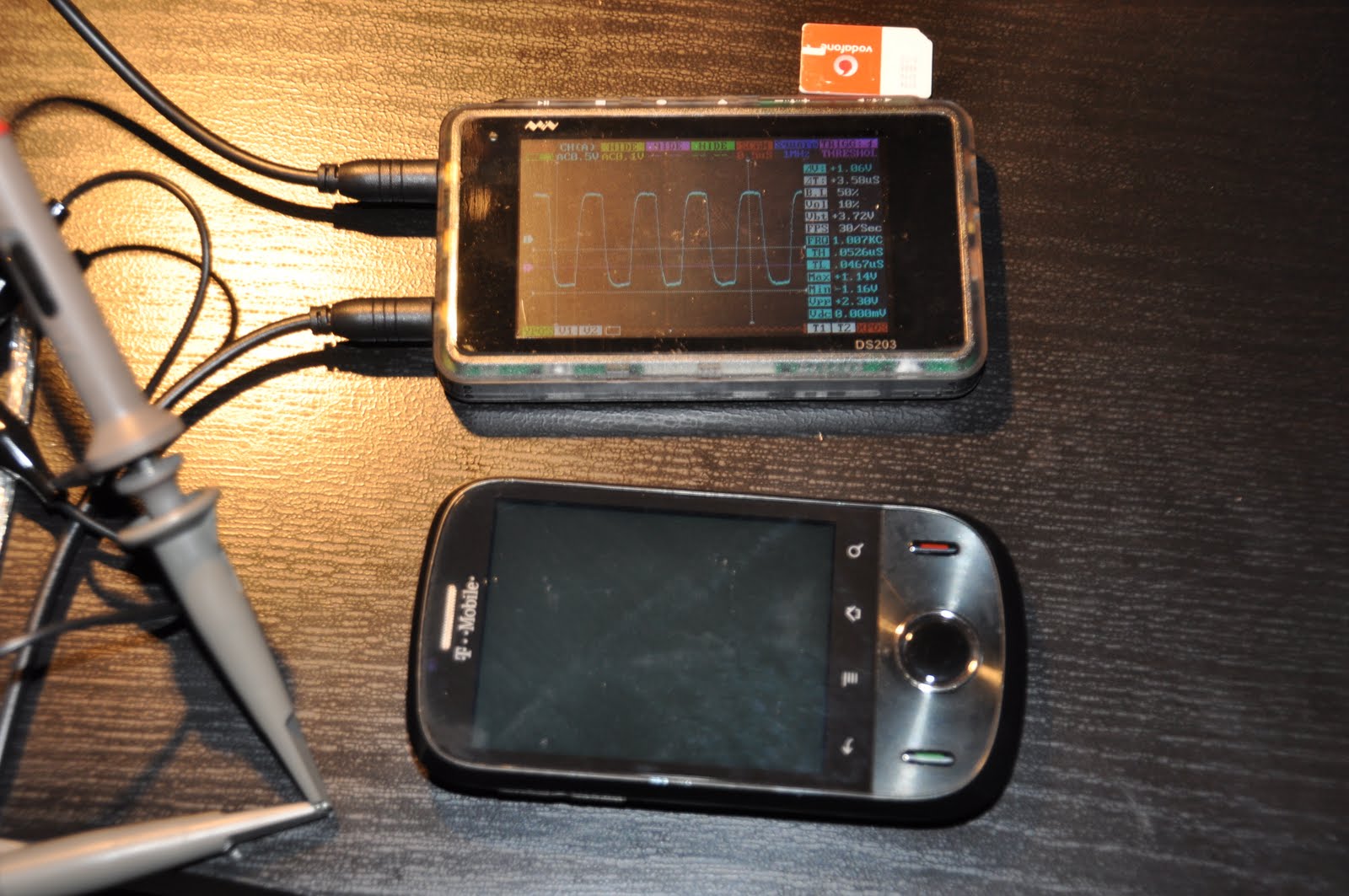 У меня возникло стойкое ощущение, что софт писали железячники которым юзабилити-шмизабилити нафиг не впёрлось: вон, идите на нашу вики, читайте наши инструкции на плохом французскоманглийском, делайте, как сказано! В общем, добрые китайци из инет-магазина, продающего эти коробочки, взяли, да написали инструкцию сами, за что им огромное спасибо. Навигация в UI какая-то невнятная, со странными переходами, но, в принципе, через час пальцы сами нужные комбинации запоминают. В работея его фоткать так руки и не дошли , но воткнул выход генератора сигналов (встроенный в девайс, кстати) в первый аналоговый канал и понастраивал картинку. Вот что получилось: